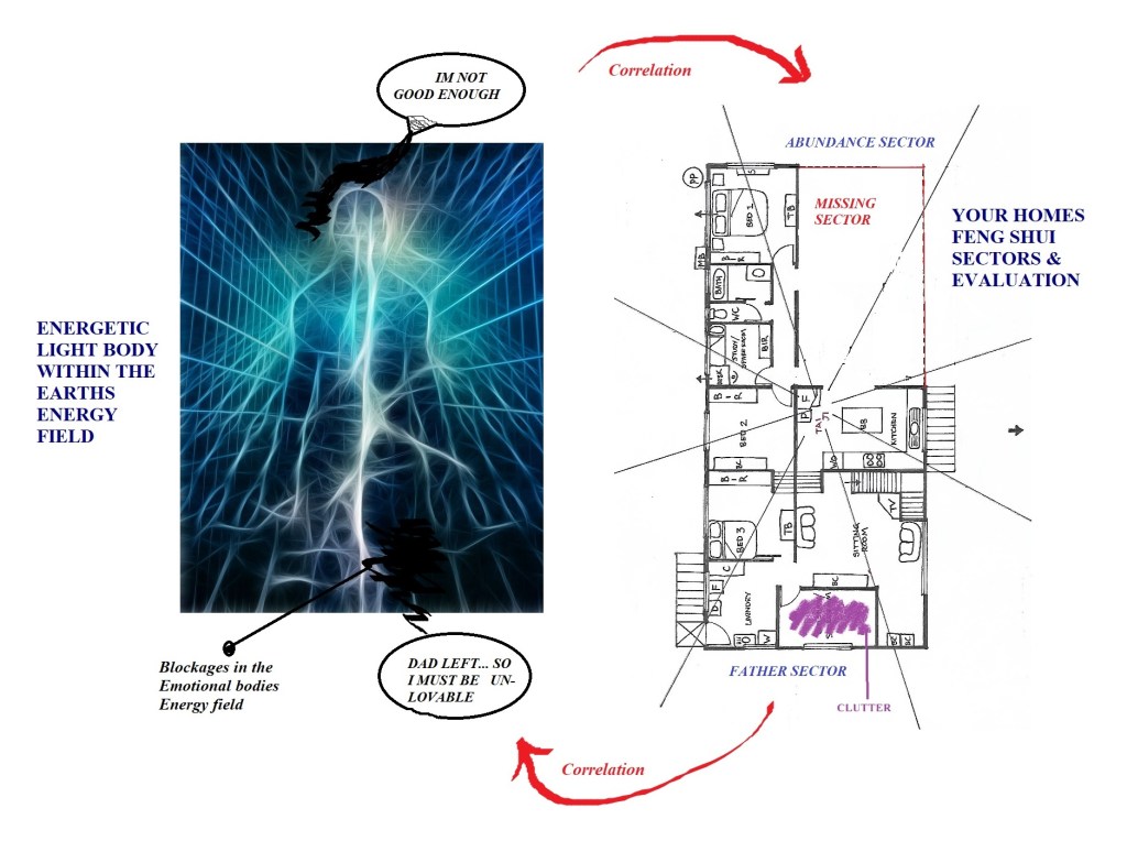 Your home has to do with your psyche… every crack, missing sector (related to Feng Shui), over stimulated, cluttered rooms and non used spaces is all a reflection of you… your beliefs and your past (sometimes past life karma as well). Your neighbors, geological location and geopathic stress factors in your environment all are symbiotic of the energetic level (or health) of your light body or energetic field in this moment of time in your life.