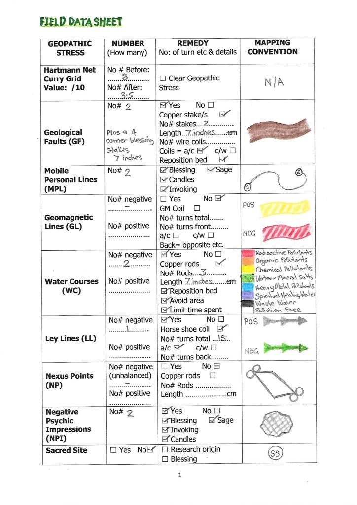 - Report book for your reference (includes information on Geobiology and your site plan evaluation & remedies placed. It lists information on all the different types of Geopathic stress so you can understand your Field Data Sheet)